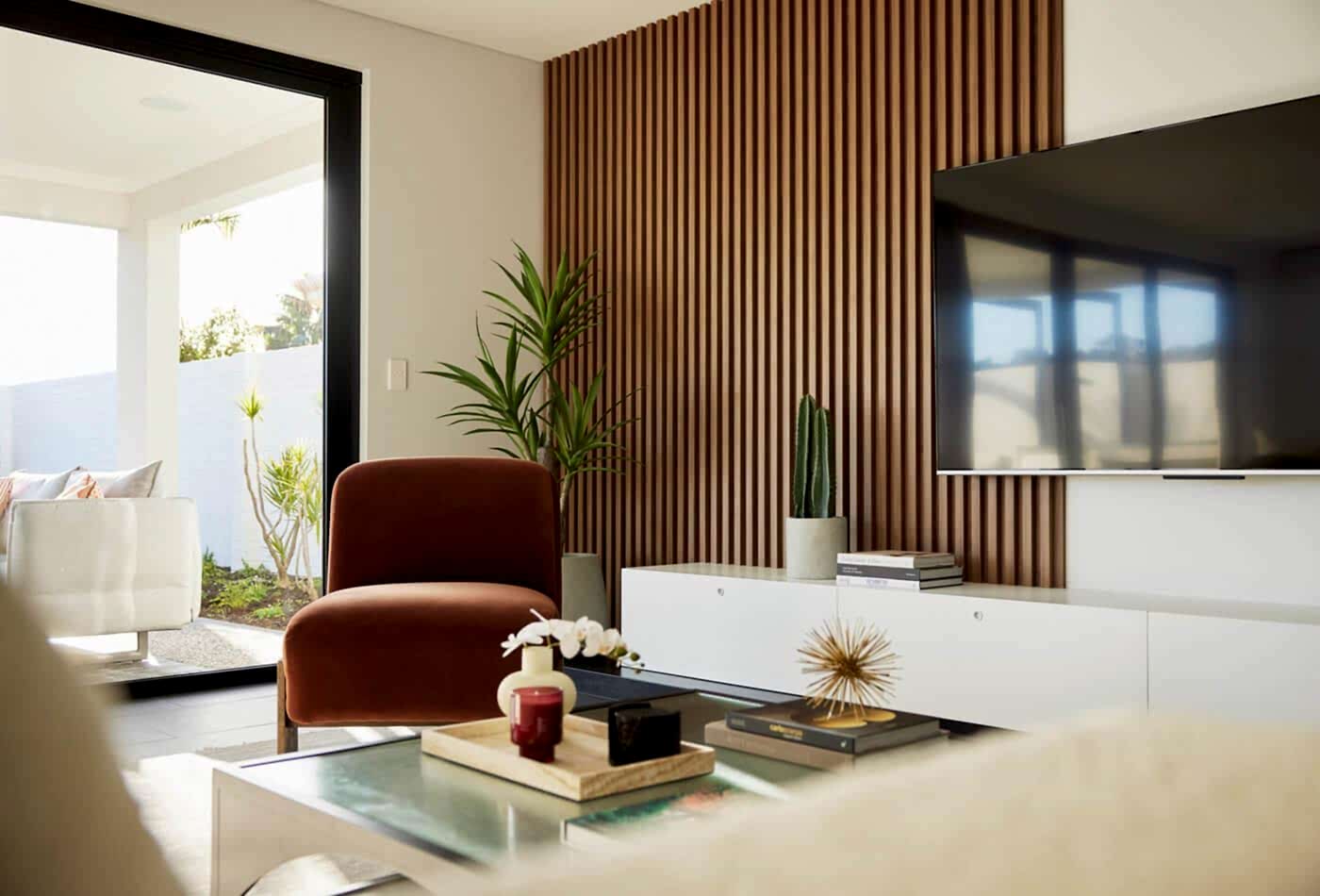 Our design team was challenged to deliver different, deliver value and most importantly, deliver a large home for a growing family – on just a 13 metre frontage. The Silkwood’s elevation, whilst contemporary, subtly presents characteristics true to the Palm Springs style of the mid-century. Natural stone cladding is used on the entry blade wall to maximise street appeal.