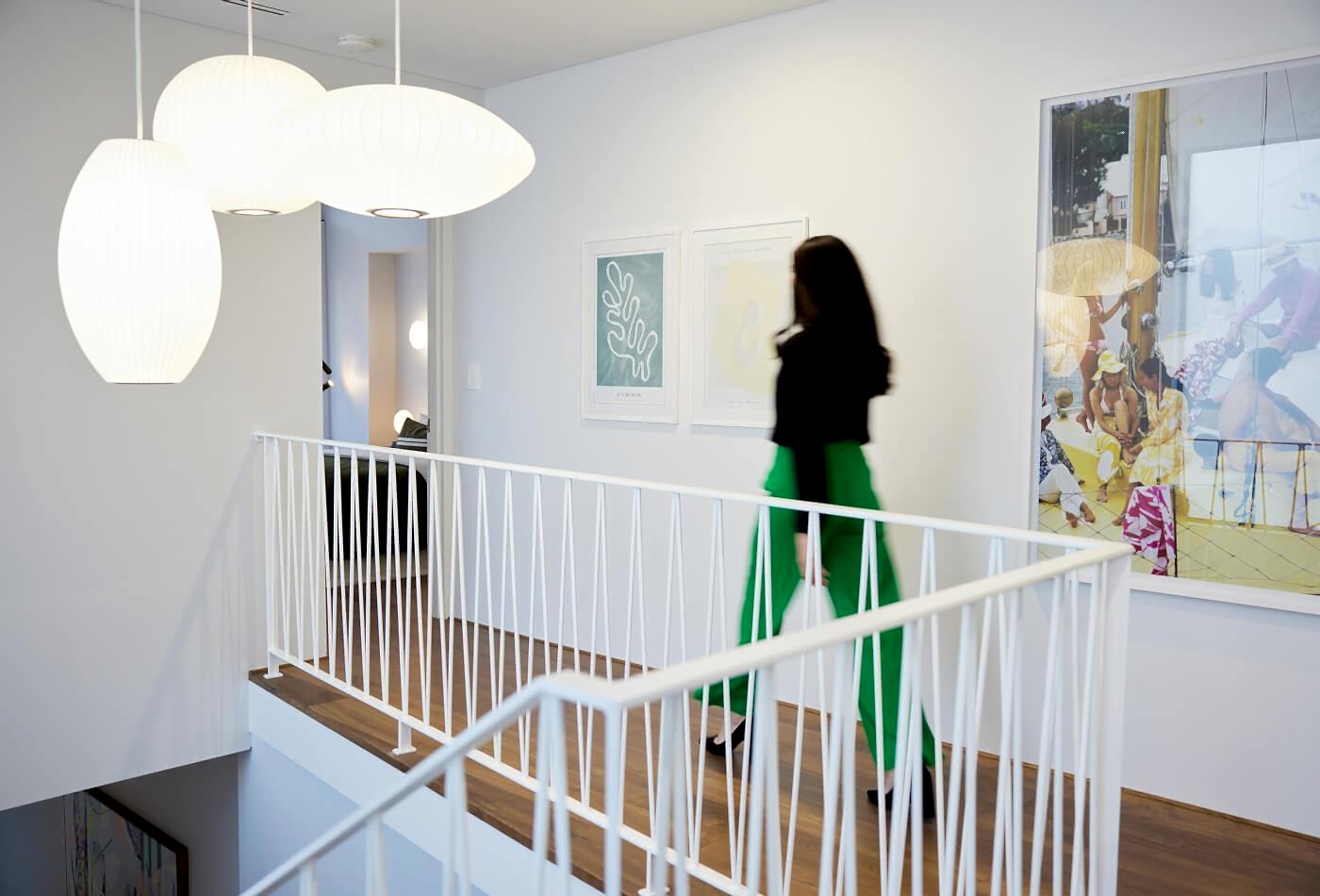 A cluster of iconic George Nelson pendant lights hang over the stair void to add visual interest - through form rather than colour.